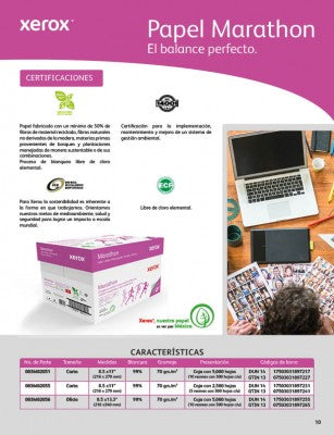 Papel Xerox Marathon 003M02051 carta 70 grs./m².Caja con 10 paquetes de 500 hojas cada una. Blancura 99%. Medidas 8.5 x 11'' (216 x 279 mm)